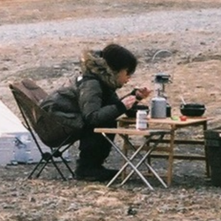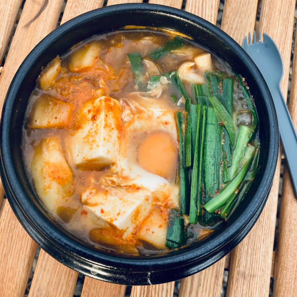 わたしがフラフラ湖畔を散歩している間にテントが3つも建てられ、キッチンスペースや焚火スペースもできていた。そして、これまたいつの間にか振舞われるスンドゥブ!こんなん家でも出てこないのに外で出るぅ?と感動。夢中でフーフーして食べた。